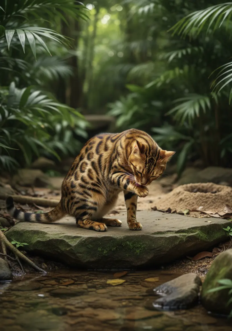 📌 Instinct de propreté : Le Bengal hérite son hygiène stricte de son ancêtre sauvage, le chat léopard d'Asie. C'est inné chez lui, un véritable héritage génétique.
